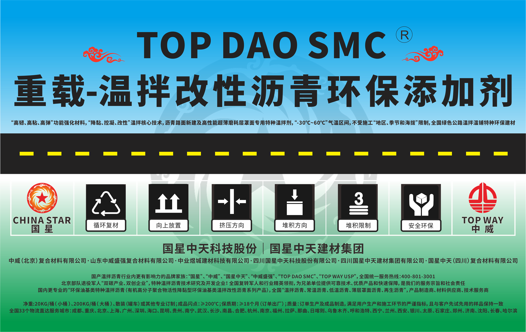国星中天集团注册商标:“TOP DAO SMC” 、“TOP WAY USP”、“国星中天”。国星中天旗下“低温改性沥青”(特种温拌改性沥青)系列产品,全球重载型道路交通专用特种绿色路面建养材料。中国低温改性沥青、有机降黏型(油基类)特种温拌沥青行业,注册商标、知名品牌,拥抱“双碳政策”!服务“低碳交通!打造中国常温沥青、低温沥青、温拌沥青、超薄沥青、再生沥青等“绿色低碳沥青”的基础研究、产品开发、生产制造、物流配送和技术服务龙头企业!